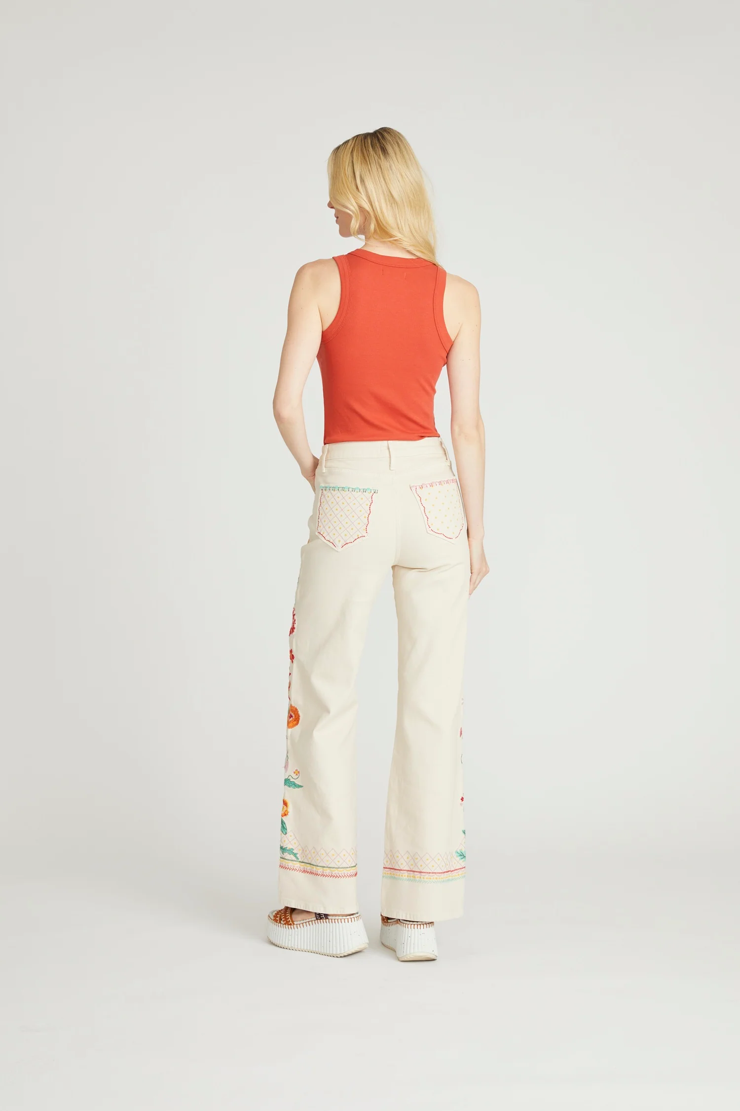 • Details: Cream wash denim, multicolor floral embroidery throughout, embroidered pocket accents, clean hem, classic five-pocket styling, zip-fly with button closure