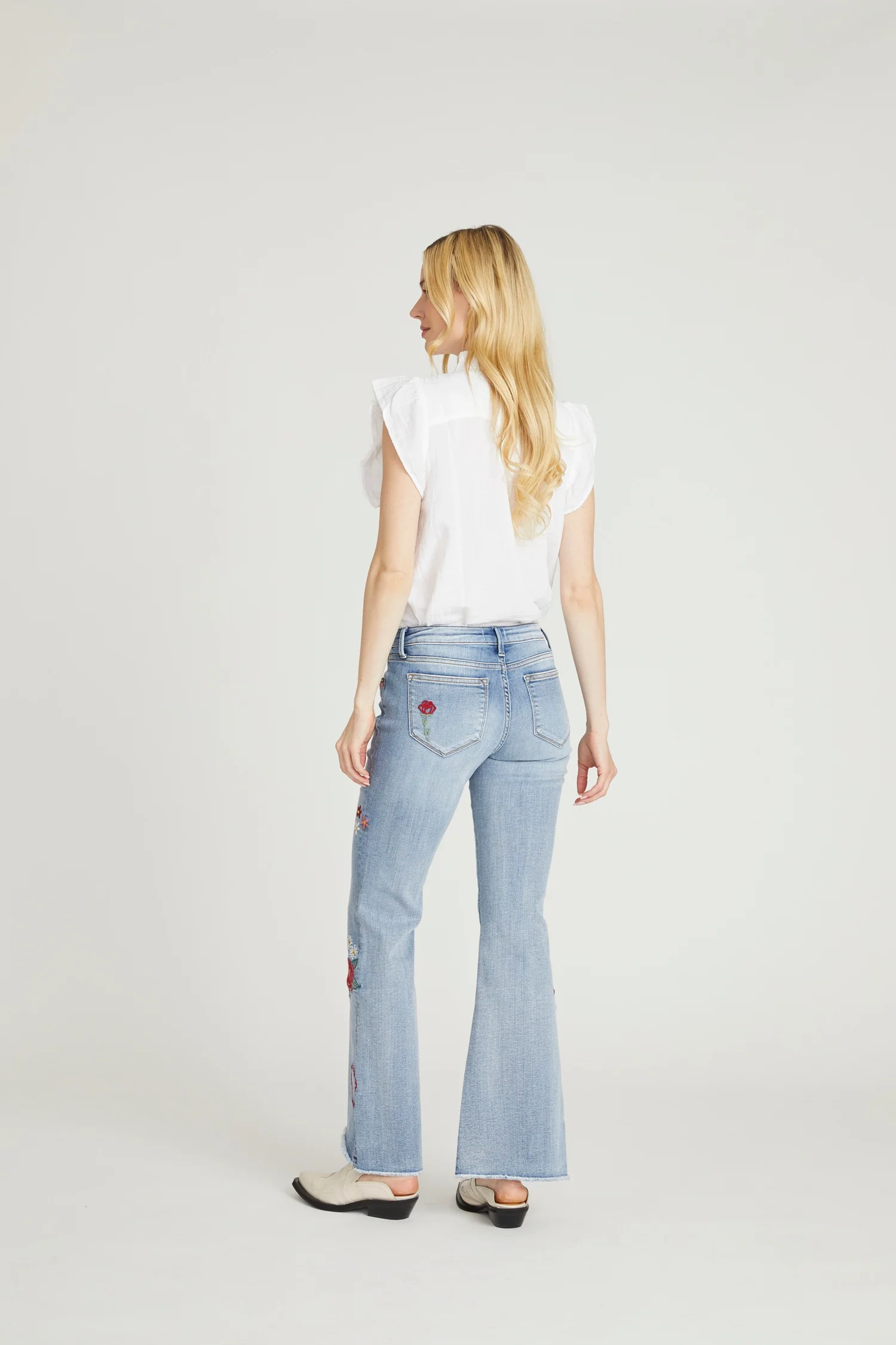 The Eva Boot Cut in Love Letters is a romantic favorite, perfect just in time for Valentine’s Day. Designed in a light wash, this flattering boot cut features playful embroidered hearts and floral accents scattered throughout. Finished with a hi-low frayed hem, this style blends vintage charm with a touch of whimsy.