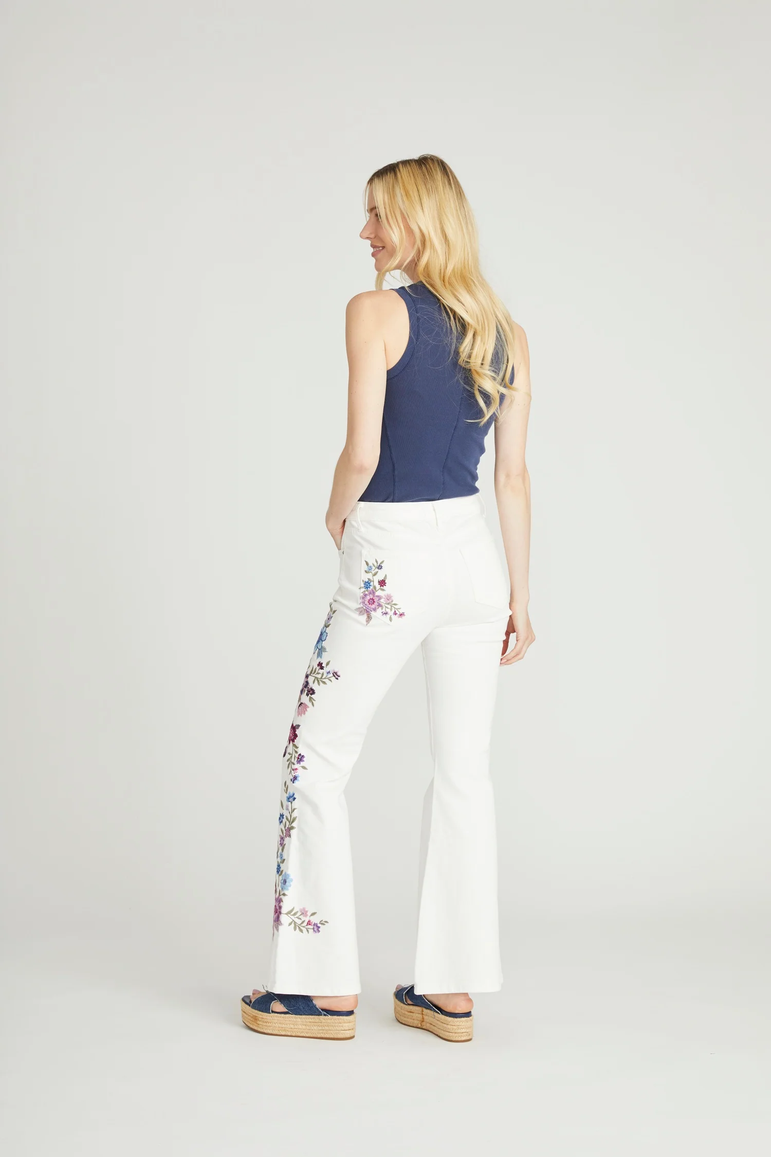 • Details: White wash, embroidered floral and blue bird placement along the legs, classic five-pocket styling, flare silhouette, zip-fly with button closure