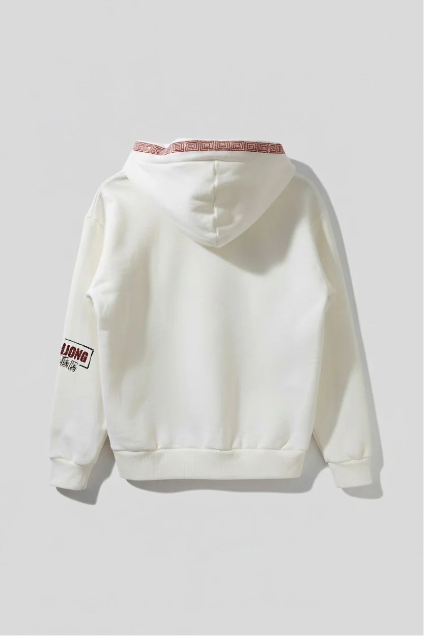 • Details: Ivory base with Mahjong-inspired embroidery and patch details throughout, contrast trim along zipper, hood, and pockets, front kangaroo pockets, embroidered sleeve and chest motifs, full-zip closure with hooded design