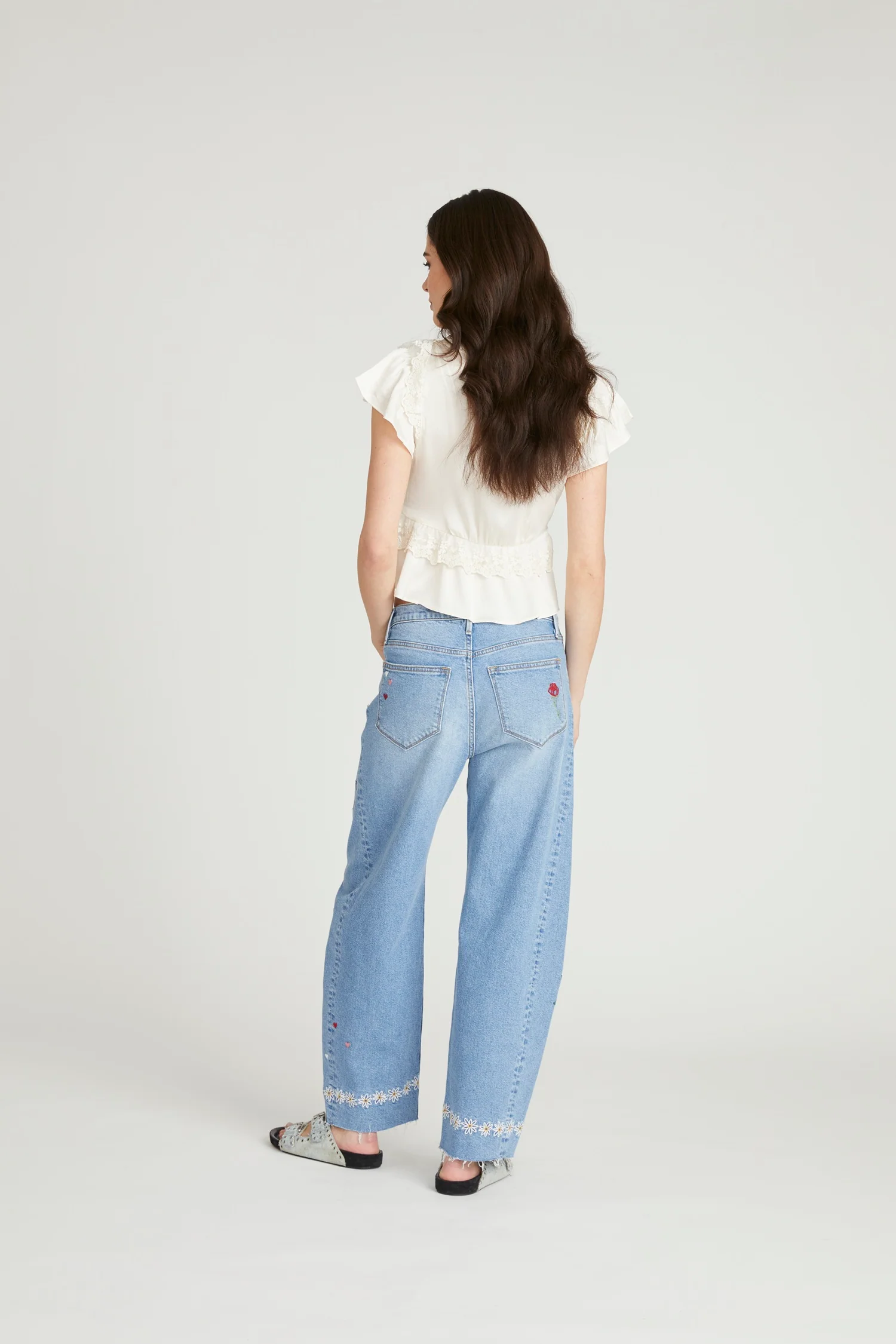 The Parker Wide Leg Barrel in Love Letters brings playful charm to a modern, statement silhouette. Designed in a light wash, this high-rise barrel jean features whimsical embroidery throughout, including hearts, florals, and handwritten-inspired details for an expressive, romantic finish. The structured wide leg with a subtle barrel shape creates an easy, fashion-forward fit that feels both relaxed and intentional.