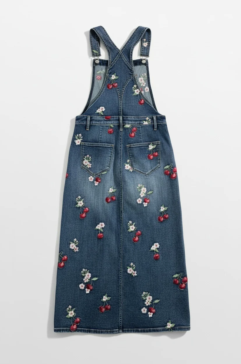 • Details: Medium to dark wash denim, cherry embroidery throughout, adjustable shoulder straps, classic bib front, functional front and back pockets, button and zip closure, center front slit
