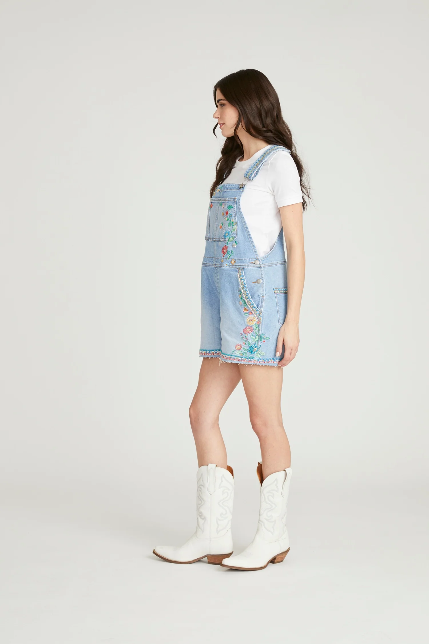 • Details: Light wash, floral embroidery with gardenia-inspired placement, decorative trim accents, embroidered strap detailing, raw frayed hem, side button closures, front bib pocket and side pockets