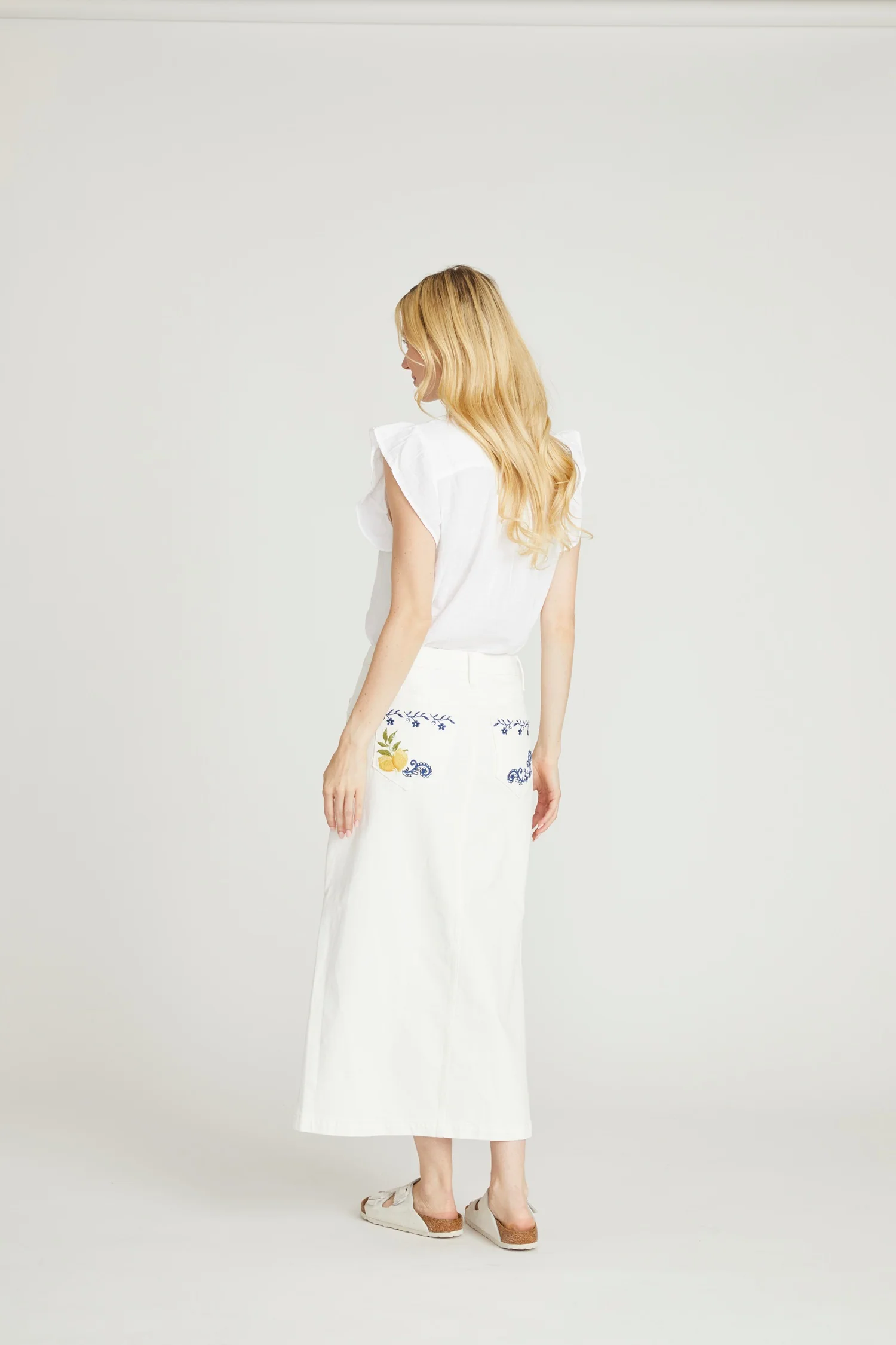 The Svetlana Skirt in Limoncello Spritz brings a crisp, Mediterranean-inspired feel to Driftwood’s signature embroidered denim. Designed in clean white denim, this elegant skirt features intricate blue floral scroll embroidery accented with vibrant lemon details that frame the silhouette with a beautifully placed border. The high-rise waist creates a flattering shape, while the long length and side slit add graceful movement and ease. Polished yet playful, the Svetlana Skirt in Limoncello Spritz is a standout piece perfect for warm-weather styling.