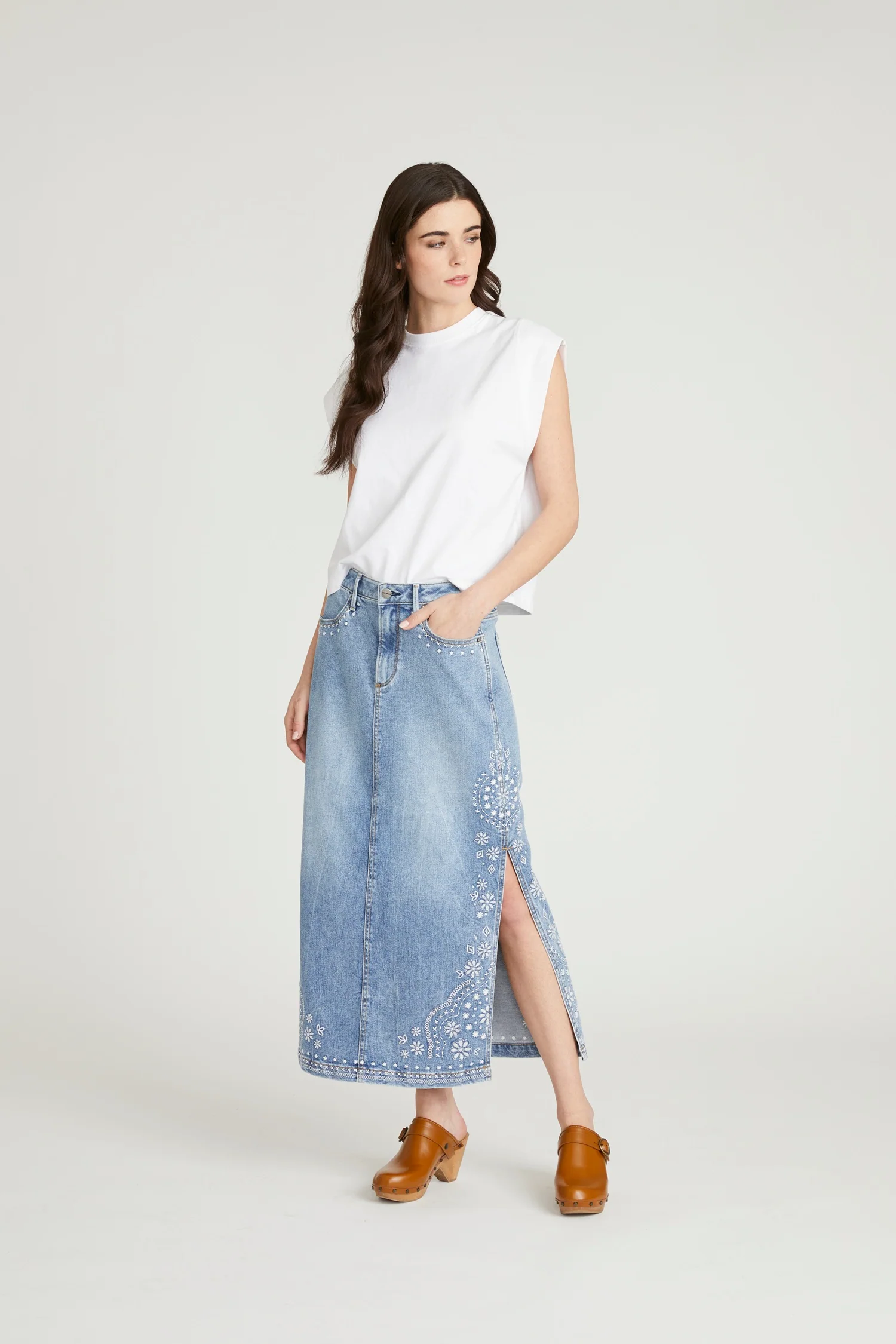 The Svetlana Skirt in Spring Snowflake offers an effortless blend of elegance and artisanal detail. Crafted in a soft light wash denim, this statement skirt features delicate white snowflake-inspired floral embroidery thoughtfully placed along the hem and side panels for a graceful, handcrafted look. The high-rise waist creates a flattering silhouette, while the long length and side slits add movement and ease with every step. Finished with subtle stud accents and soft stretch for comfort, the Svetlana Skirt brings a refined yet relaxed feel to everyday styling.